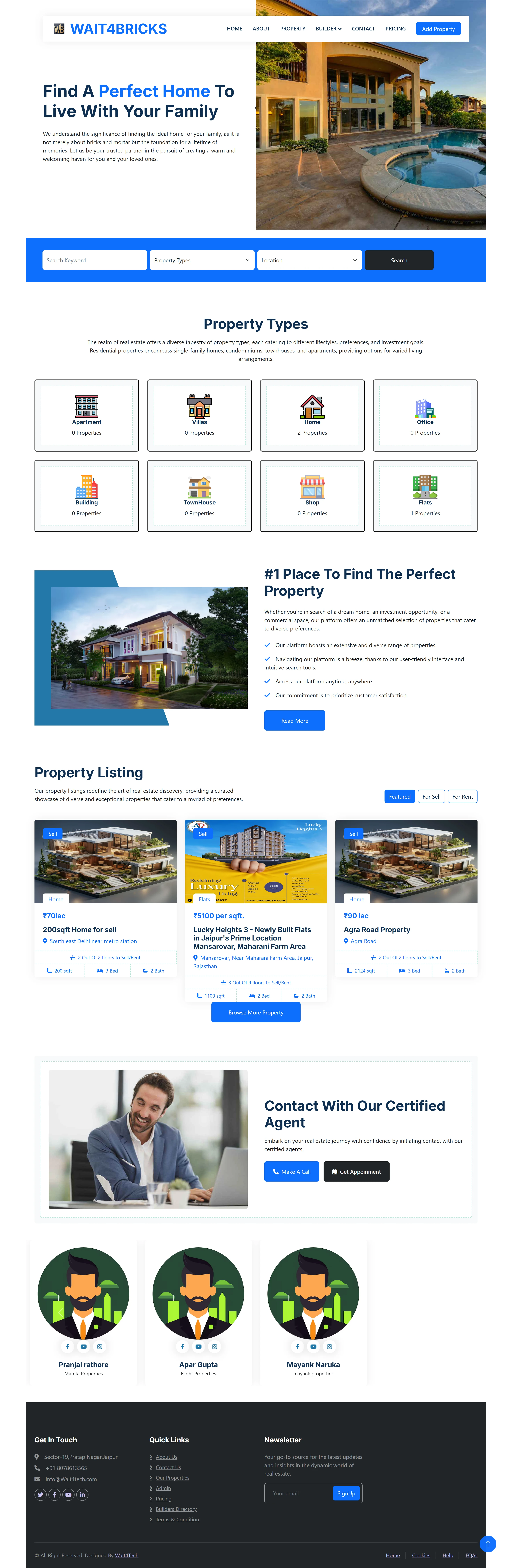 Wait4Bricks is a premier online platform connecting property buyers, sellers, and investors with ease. Offering an extensive range of properties, from dream homes to lucrative investment opportunities, it caters to diverse preferences. The user-friendly interface and intuitive search tools simplify property exploration and transactions. Sellers can showcase their properties effectively, reaching a broad audience of potential buyers and investors. Responsive design ensures seamless access across devices, enhancing user experience. Secure communication channels facilitate safe interactions between parties. Regular updates and newsletters keep users informed about the latest property listings and market trends. Developed by Wait4Tech, Wait4Bricks leverages cutting-edge technology to revolutionize the real estate industry.