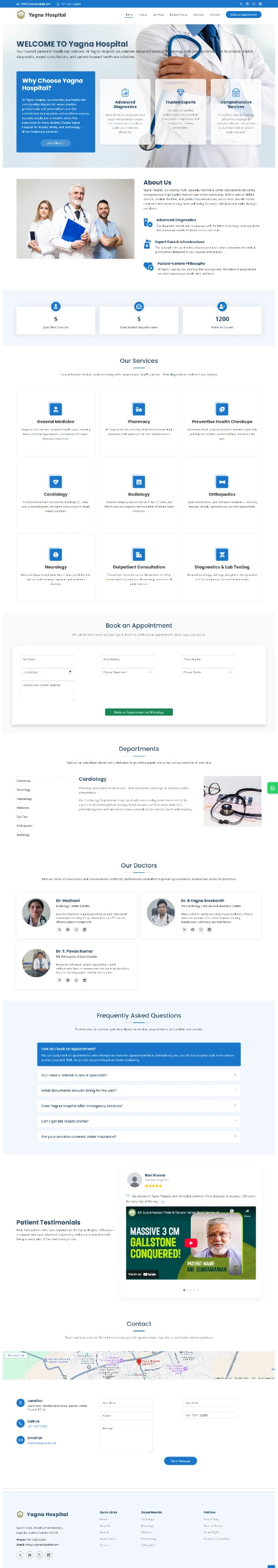 Yagna Hospital is a state-of-the-art healthcare facility committed to delivering high-quality medical care with compassion. From general health services to specialized treatments, we offer a wide range of medical solutions tailored to patient needs. Our modern infrastructure and advanced diagnostic tools ensure accurate and timely treatment. Patients can easily access appointment scheduling, health records, and teleconsultation services through our user-friendly portal. Our team of experienced doctors, nurses, and support staff work round-the-clock to provide exceptional care. Mobile-responsive design ensures patients can connect with us anytime, anywhere. We maintain strict data security protocols to safeguard patient information and communication. Developed by Wait4Tech, Yagna Hospital's digital presence reflects innovation and dedication to transforming patient care.